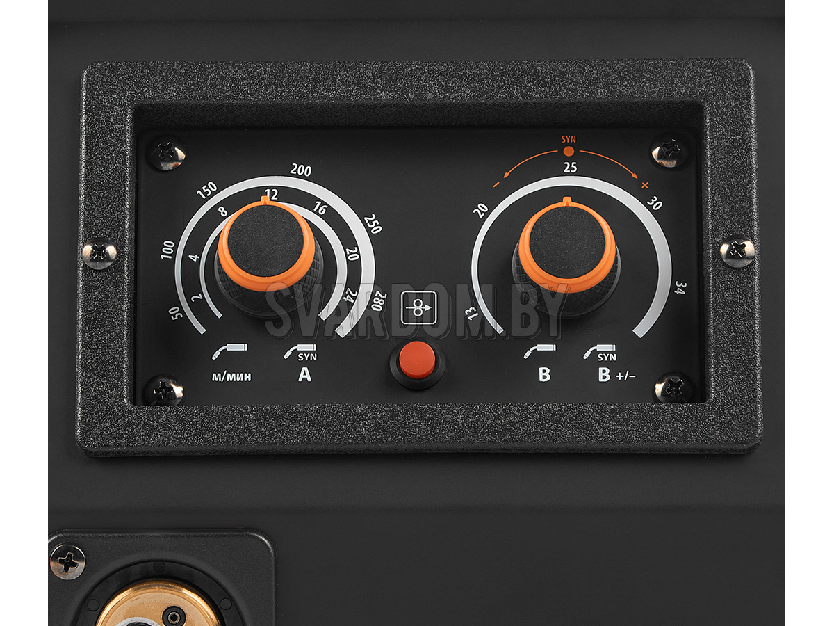 - Левый регулятор параметров сварки позволяет регулировать скорость подачи проволоки ( MIG/MAG ), силу тока ( MIG/MAG SYN, TIG Lift , ММА),силу тока заварки кратера ( MIG/MAG SYN 4Т/ MIG/MAG 4Т)
