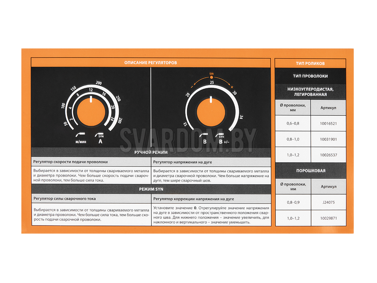 - Защита от перегрузки механизма подачи проволоки по току и напряжению