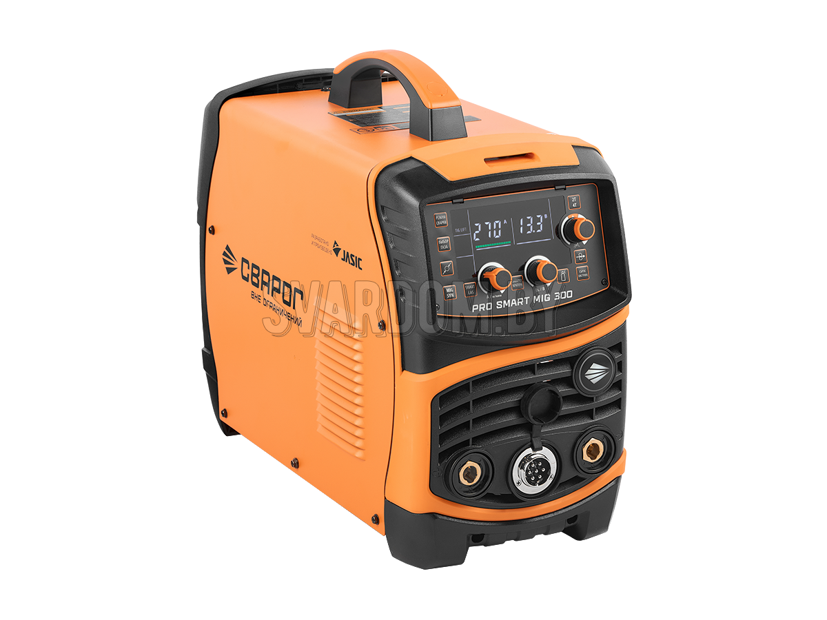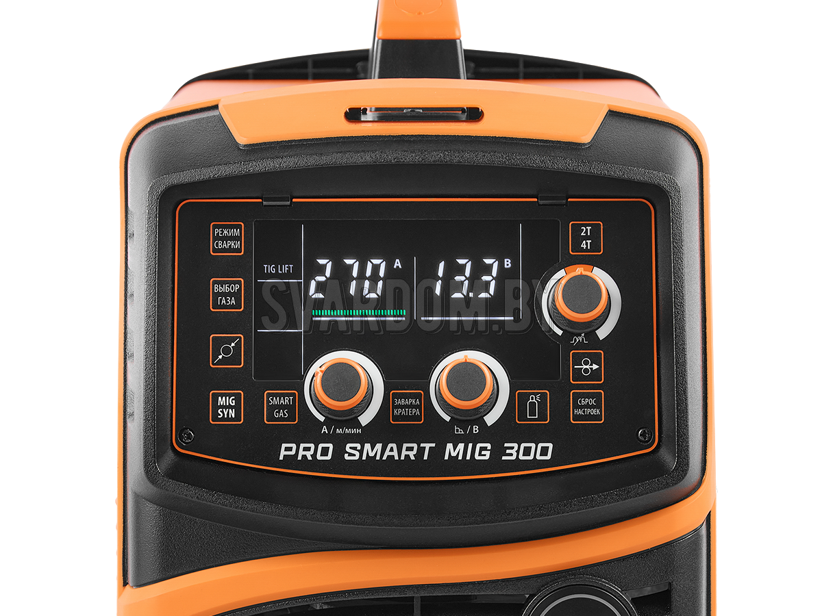 PRO SMART MIG 300 (N253S) — инвертор для полуавтоматической сварки сплошными проволоками (MIG/MAG), для ручной дуговой сварки покрытыми электродами (MMA), а также аргонодуговой сварки неплавящимся электродом (TIG) при -30 °C.